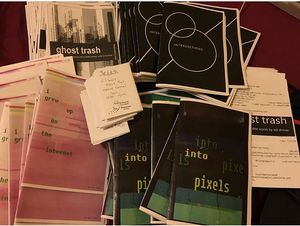 Printed glitch art, stickers, and Zines about DIY tech maintenance, zines as directions for creative activities, and semi autobiographical. Low tech low life.